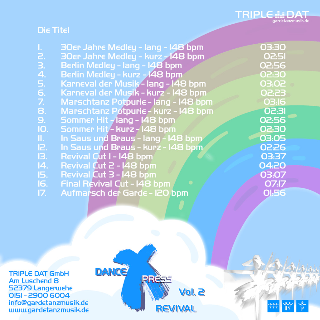 Alle Titel sind instrumental gespielt und liegen in langer und kurzer Version im Tempo 148bpm vor. Zusätzlich findest Du auf der Download-CD vier Revival-Cuts - fertige Zusammenschnitte aus dem TRIPLE DAT Tonstudio für Deinen besten Tanz!